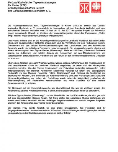 Das interaktive Figurentheaterstück „Pfoten weg!“ hilft schon Kinder ab vier Jahren dabei, solch eine Grenzüberschreitung zu erkennen. Anhand der Geschichte dreier Katzenkinder, denen der Besuch von Onkel und Tante bevorsteht, lernen die Kinder, dass ihre Gefühle wichtig sind und dass sie offen über diese sprechen können und auch sollten. Sie lernen, dass es gute und schlechte Geheimnisse gibt, dass ihr Körper nur ihnen gehört und dass sie niemals Schuld haben.