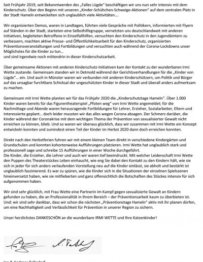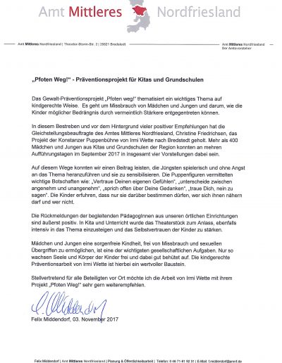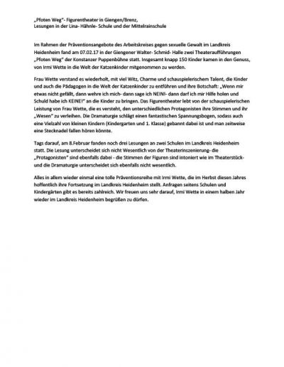 Seit fast 2 Jahrzehnten folgt Irmi Wette mit „Pfoten weg!“ der Mission, sexualisierte Gewalt gegen Kinder zu verhindern und zu beenden. In dieser langen Zeit haben über 72.000 Kinder das Figurentheaterstück und den begleitenden Aktionstag erlebt.