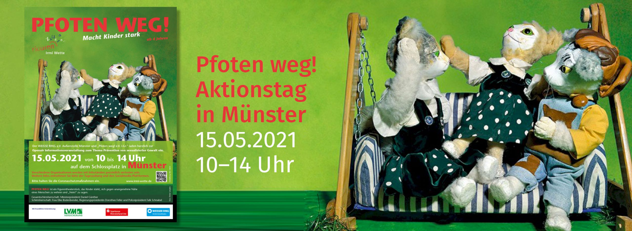 im Rahmen des Projekts „Pfoten weg!“ laden der WEISSE RING e.V. und die FigurenZauberei unter der Schirmherrschaft von Frau Elke Büdenbender, Regierungspräsidentin Dorothee Feller und Polizeipräsident Falk Schnabel herzlich alle Grundschulen in Münster und Umgebung zu kostenfreien „Pfoten weg!“ Figurentheater-Aufführungen ein – coronabedingt im Online-Format.